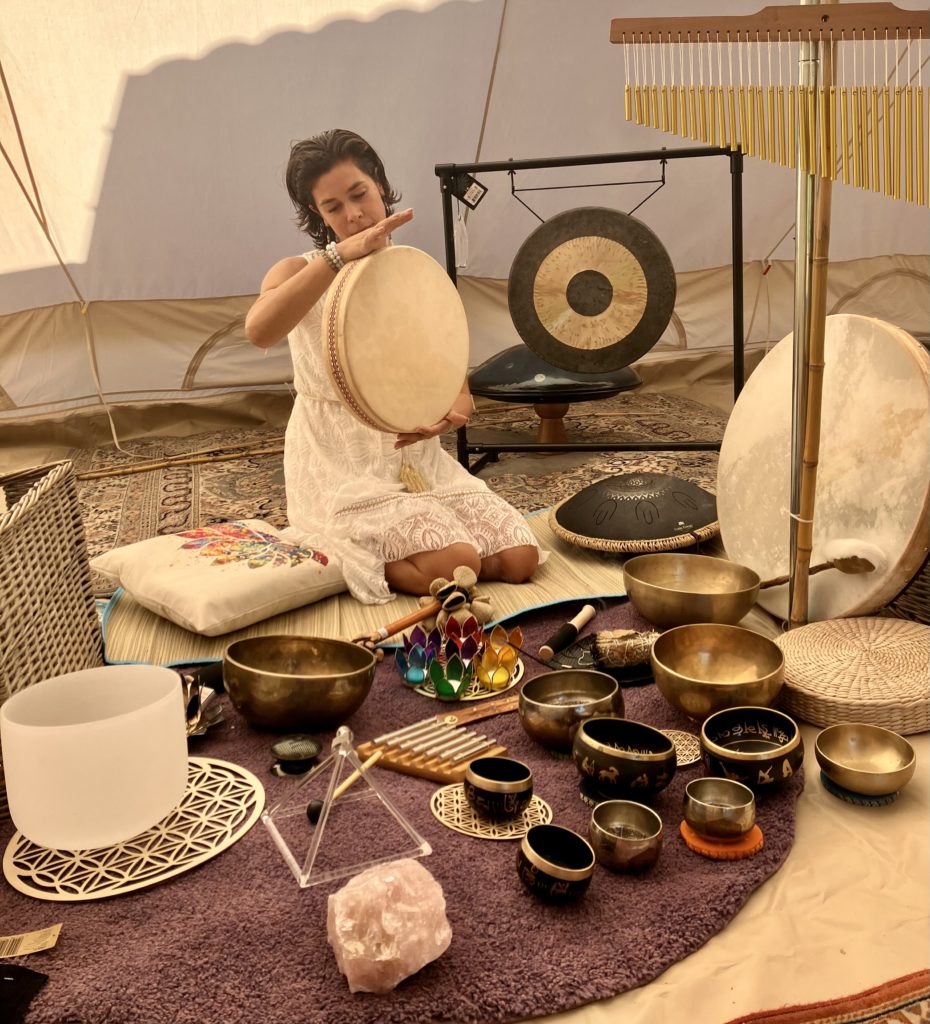 Puis j’utilise mes instruments , tambours, bols, carillons, pour t’amener dans un espace où les frontières s’effacent.