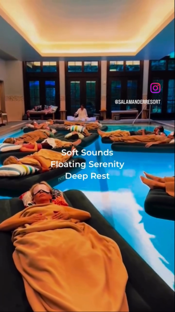 Les bols tibétains plongés dans l’eau diffusent leurs ondes dans toute la piscine, et comme nous sommes faits à plus de 70 % d’eau, ces vibrations se propagent directement dans ton corps, créant une harmonisation profonde, presque cellulaire.